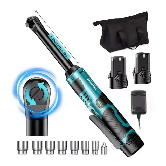This cordless ratchet wrench takes the hassle out of car repairs, furniture assembly, and any task that requires working in tight areas. Its long reach design makes it stand out, while the two rechargeable batteries ensure you never run out of power during a job. With its variable speed control and powerful torque, you get precise performance every time. The built-in LED light adds convenience, especially when working in garages or dark spaces.