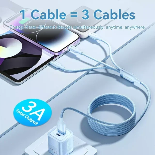 Upgrade your charging experience with this practical and reliable 3-in-1 cable. Whether you’re powering your smartphone, tablet, or other gadgets, it’s the ultimate solution for convenience and efficiency. Get yours today and simplify your charging routine!