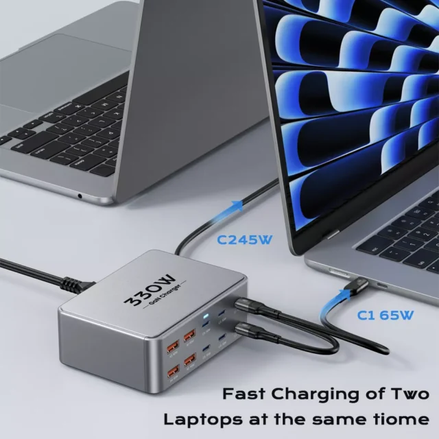 Say goodbye to messy cables and multiple chargers. This 330W GaN Multiport USB-C Fast Charging Station is designed to power all your devices at lightning speed from one compact hub. With 10 versatile ports, including 6 USB-C and 4 USB-A, it can charge laptops, smartphones, tablets, and more all at once. Thanks to advanced GaN technology, it delivers faster, cooler, and more efficient charging in a sleek, space-saving design.