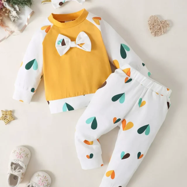 Dress your little one in style with this 3-piece baby girl autumn outfit set, designed to keep her cozy and charming through every special moment. Featuring a soft long-sleeved top with a cute bow, heart-patterned pants, and a matching headband, this set is the perfect blend of comfort and fashion. Whether for playdates, family gatherings, or adorable photo shoots, your baby will be dressed to impress.