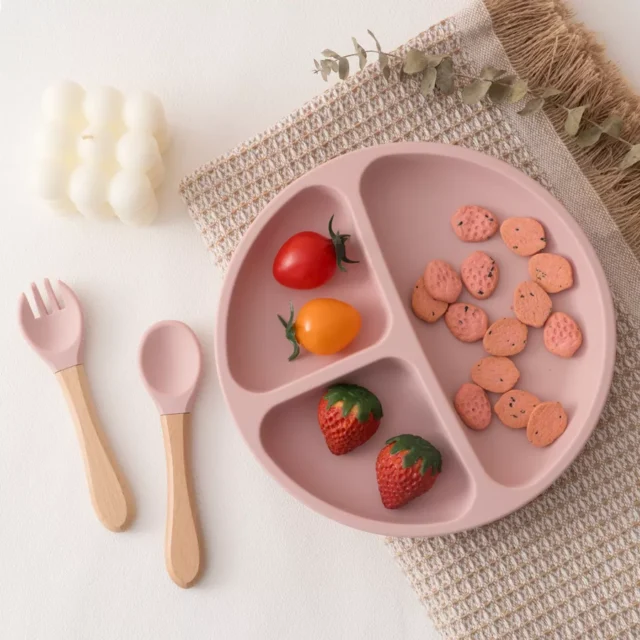 This baby tableware set combines functionality with child-friendly design. The plate features a strong suction base to keep meals in place, preventing spills and messes. The utensils are made with food-grade, BPA-free silicone, ensuring safety and durability, while the smooth wooden handles add a natural, easy-grip touch. With its simple solid-color design, this set complements any table setting.