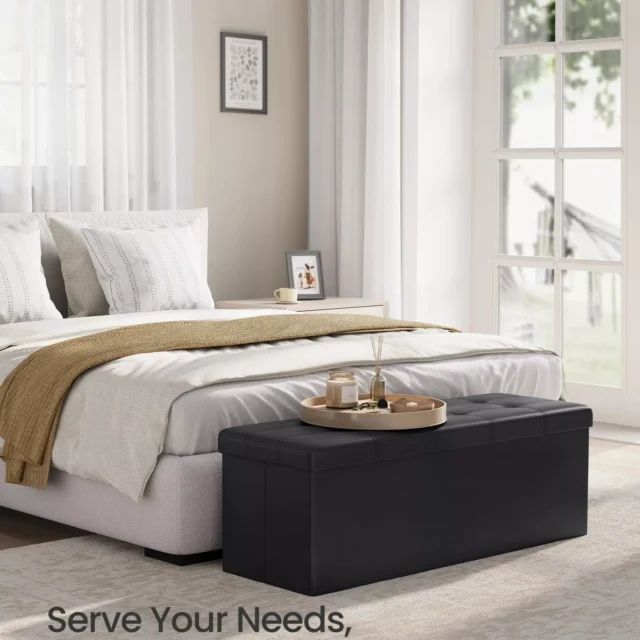 Transform any room with this versatile 43-inch folding storage ottoman bench. Featuring a sleek faux leather finish and a comfortable padded seat, it adds both style and function to your home. Whether placed at the end of your bed, in front of your sofa, or in the entryway, this multipurpose piece serves as extra seating, a coffee table, or a footrest—all while keeping your space organized.