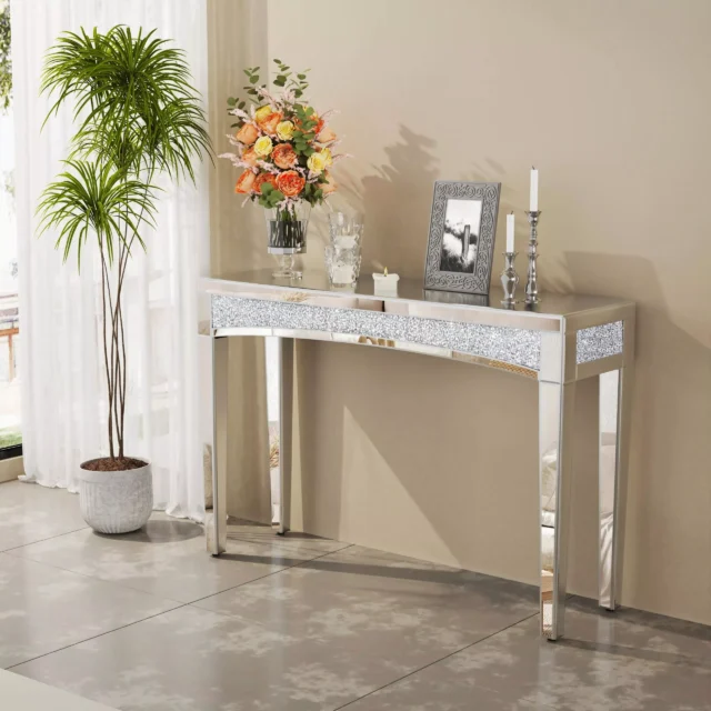 Bring sparkle and sophistication into your home with this stunning 47.2″ mirrored console table. Designed with a sleek silver finish and adorned with a dazzling crushed diamond inlay front, it instantly transforms any living room, entryway, or foyer into a glamorous space. The reflective mirrored surfaces catch the light beautifully, creating an upscale atmosphere while complementing a variety of décor styles.