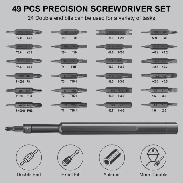 Take on any repair task with confidence using this 49-piece precision screwdriver set. Designed for professionals and DIY enthusiasts alike, this compact kit includes 24 double-end magnetic bits made of durable chrome-vanadium steel, ensuring long-lasting strength and versatility. Whether you’re fixing an iPhone, replacing watch batteries, or assembling a PC, this set has the right tool for the job.