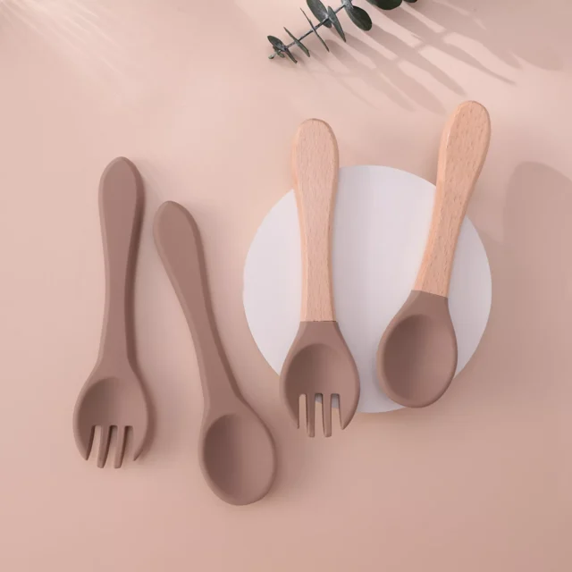 4PCS Silicone Baby Spoon & Fork Set with Wooden Handles | BPA Free Utensils