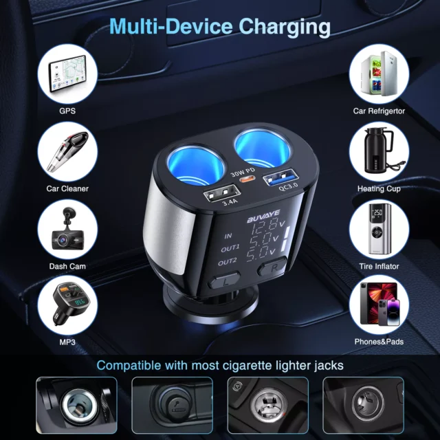 This charger stands out because it’s not just a single-function device. It’s a compact hub designed for multitasking—perfect for drivers who need to power several gadgets at once. Its fast 30W USB-C output means less waiting and more doing. The dual cigarette lighter sockets add extra flexibility for devices like GPS units, dash cams, or even portable refrigerators. Suitable for both 12V and 24V systems, it works flawlessly in cars, trucks, and SUVs.