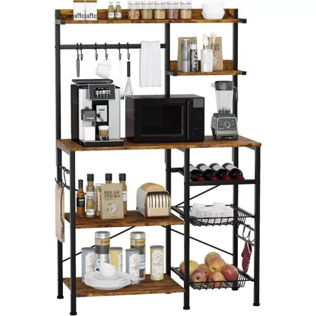 Featuring a thoughtful design with 2 pull-out wire baskets, a sturdy microwave stand, a convenient wine rack, and additional storage shelves, this baker’s rack is the ultimate solution for keeping your essentials within reach. Whether you’re a culinary enthusiast or someone who appreciates an organized space, this rack offers the perfect blend of style and functionality.