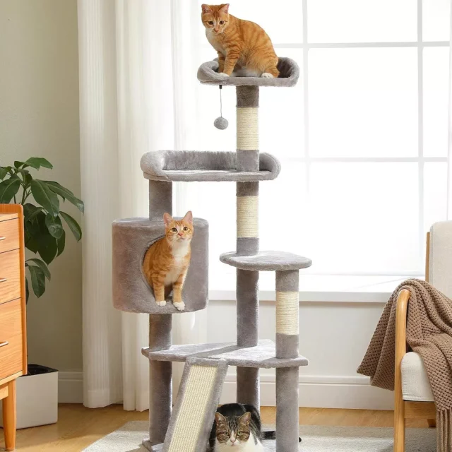 Indoor cats need more than just toys—they crave climbing, scratching, and lounging spots to keep their bodies and minds active. This cat tree combines all these essentials in one convenient space. Unlike ordinary trees, it offers an extra-wide perch and a ramp that doubles as a scratching surface, making it a unique upgrade for your cat’s indoor lifestyle.