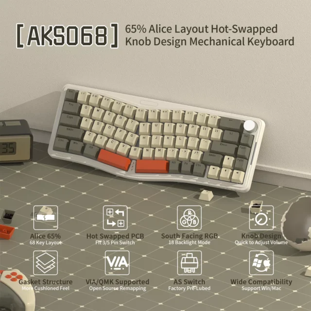 Whether you’re battling in fast-paced games or working on creative projects, this keyboard is built to adapt. Its compact 65% size saves desk space while still giving you all the essential keys you need. The RGB backlighting makes every keystroke pop, while the VIA software ensures full control over customization. The ergonomic Alice layout adds comfort and reduces wrist fatigue, so you can play or work longer without discomfort. Best of all, the hot-swappable feature means you can fine-tune your typing sound and feel anytime you want.
