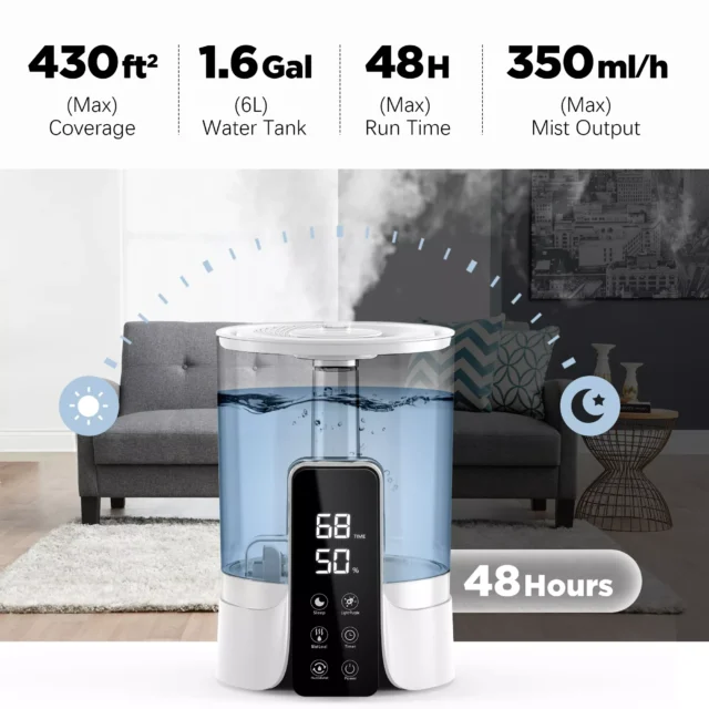 With a large 1.58-gallon (6-liter) capacity, it provides up to 48 hours of continuous mist on low mode, eliminating the need for frequent refills. The top-fill design makes adding water and cleaning incredibly simple, while the built-in auto shut-off ensures safe operation when water runs low. Three adjustable mist levels, a 360° rotating nozzle, and quiet operation make this humidifier as functional as it is soothing. The included remote and timer settings offer hands-free convenience from across the room, giving you complete control with ease.