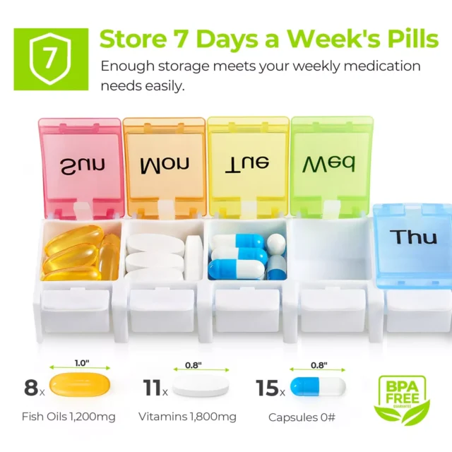 With its practical design and easy-to-use layout, this weekly pill organizer is more than just a storage box – it’s a simple way to bring order to your daily routine. Plan your doses in seconds and enjoy peace of mind knowing you’ll never miss a pill again. Add it to your cart now and make every day healthier and stress-free!