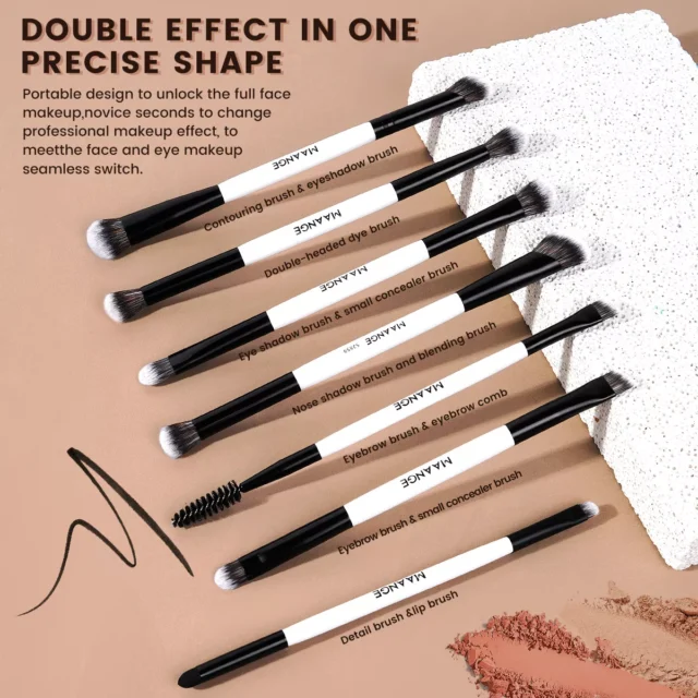 This makeup brush set is crafted with high-quality synthetic hair, ensuring ultra-soft bristles that gently apply your cosmetics. The double-ended design offers versatility, allowing you to seamlessly transition between eyeshadow, eyeliner, and even blending. The ergonomic handle ensures a comfortable grip, making it easy to apply makeup like a pro.