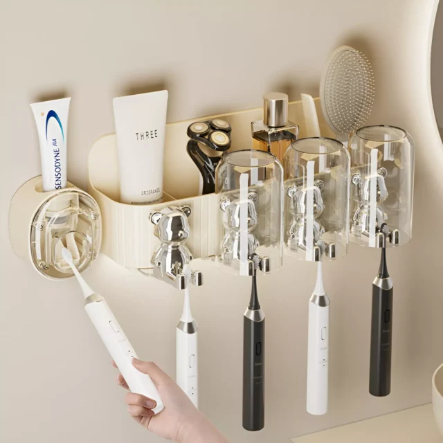 Turn your daily routine into a delightful experience with this adorable bear-shaped toothbrush holder. Designed to bring charm and convenience to your bathroom, this multifunctional accessory combines a toothbrush holder, an automatic toothpaste dispenser, and a mouthwash cup rack all in one. Its punch-free installation makes it easy to set up without drilling holes or damaging your walls.