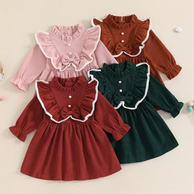 Let your little girl step into the season in sweet, cozy style with this Autumn Corduroy A-Line Dress. Designed to keep her warm, stylish, and comfortable, this dress is perfect for those crisp fall mornings and breezy spring afternoons. The soft corduroy fabric adds a touch of vintage charm, while thoughtful details like the ruffled long sleeves, mock neck, and delicate bow accent make it a true showstopper. Whether it’s for a birthday party, a day at preschool, or family photos, this dress brings effortless elegance to any occasion.
