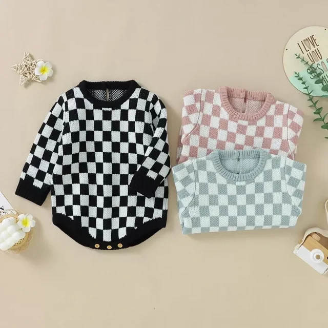 This romper combines practicality with timeless style. The knitted fabric keeps your little one cozy without being too heavy, while the plaid pattern adds a classic touch that suits any occasion. It’s easy to mix and match with leggings, tights, or little booties, making it a versatile piece for everyday wear. Designed with care and free from harsh chemicals, it’s safe for sensitive skin and perfect for your growing baby.