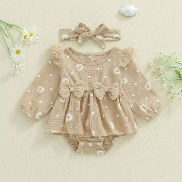 Crafted from a breathable blend of 95% cotton and 5% elastane, this romper dress keeps your baby comfy during fall strolls, family gatherings, or cozy indoor play. The long sleeves offer warmth, while the crew neckline ensures easy dressing. The daisy print pops against soft green or khaki hues, making it an instant seasonal favorite. The matching headband completes the look with an extra dose of cuteness.