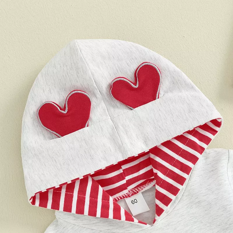 Embrace the spirit of love and warmth for your little one. Click ‘Add to Cart’ now and make this Valentine’s Day unforgettable with our Heart Print Hooded Romper!