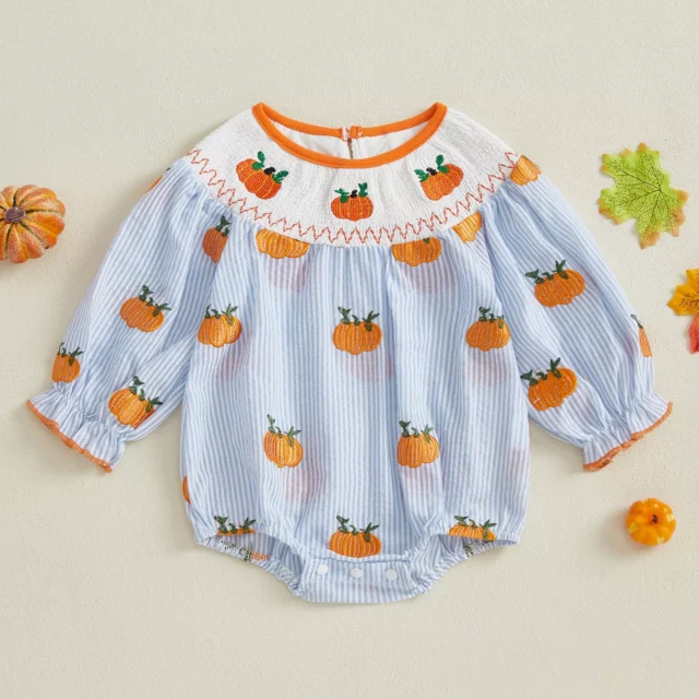 This romper is more than just adorable—it’s practical too. The soft cotton-polyester blend feels gentle on your baby’s skin, while the crew neck and long sleeves provide warmth during cooler autumn days. The striped design with festive pumpkin embroidery gives it a unique seasonal touch that makes it stand out from everyday outfits. Easy covered button closures ensure quick dressing and diaper changes without the fuss.