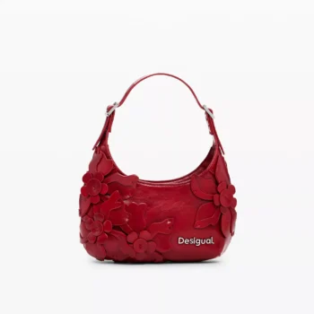 Desigual Small Red Faux Leather Shoulder Bag with Floral Appliqués