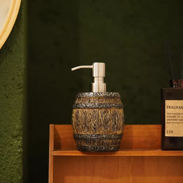 Designed to be both decorative and functional, this soap dispenser is the ideal accent for creating a cozy, rustic atmosphere in any room. The lifelike barrel details and earthy color palette blend seamlessly with cabin-inspired, farmhouse, or industrial themes, instantly elevating your decor. Pair it with whiskey-themed coasters, salt shakers, or other rustic accents to create a cohesive look and bring out the best in your personal space.
