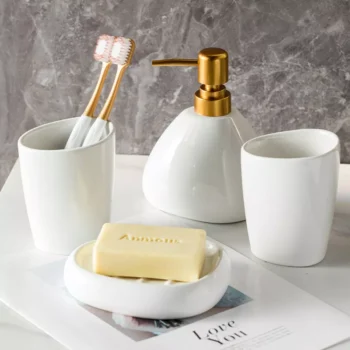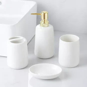 Elegant White Ceramic Bathroom Accessory Set with Lotion Bottle and Soap Dish