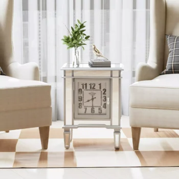 Antique Silver Mirrored Bedside Table with Built-in Arabic Clock & Storage