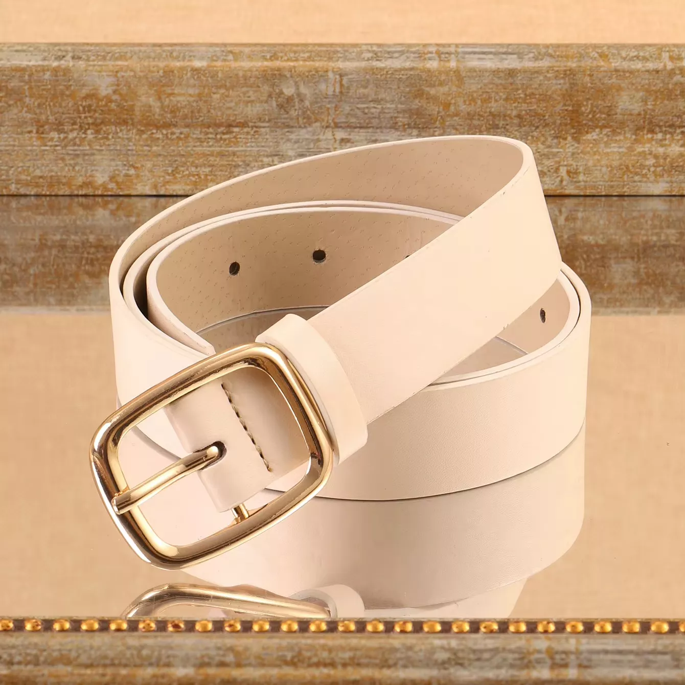 High-End Women’s PU Leather Belt with Gold Metal Square Buckle