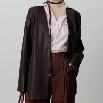 Women’s Loose PU Leather V-neck Jacket with Ribbon