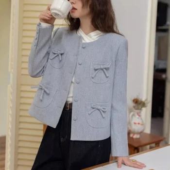 Elegant Korean Style Bow Pockets Short Coat for Women