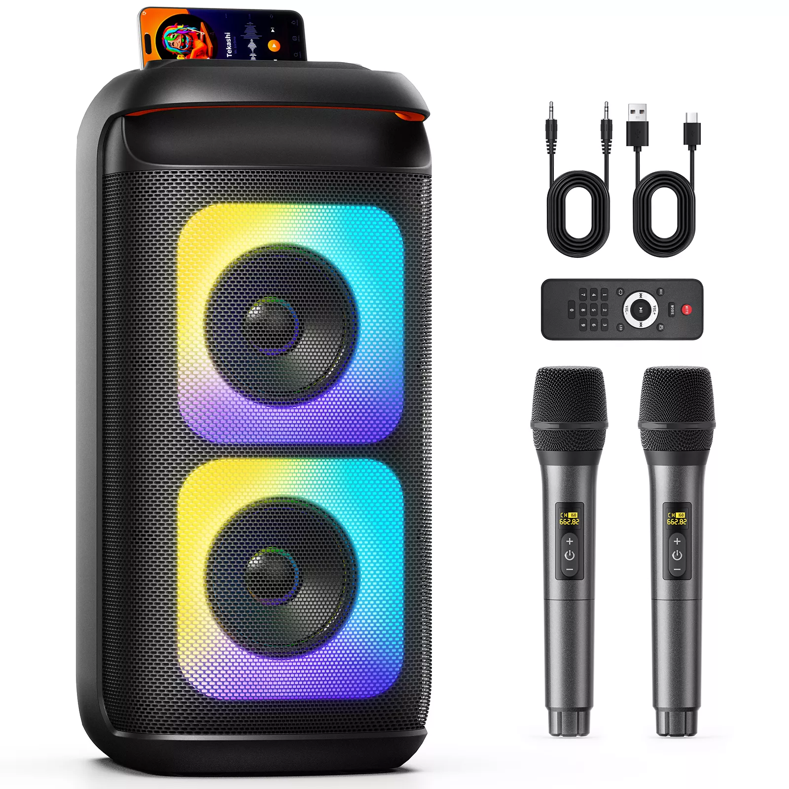 T37 Karaoke Machine with Dual 8″ Subwoofers & 2 Wireless Microphones