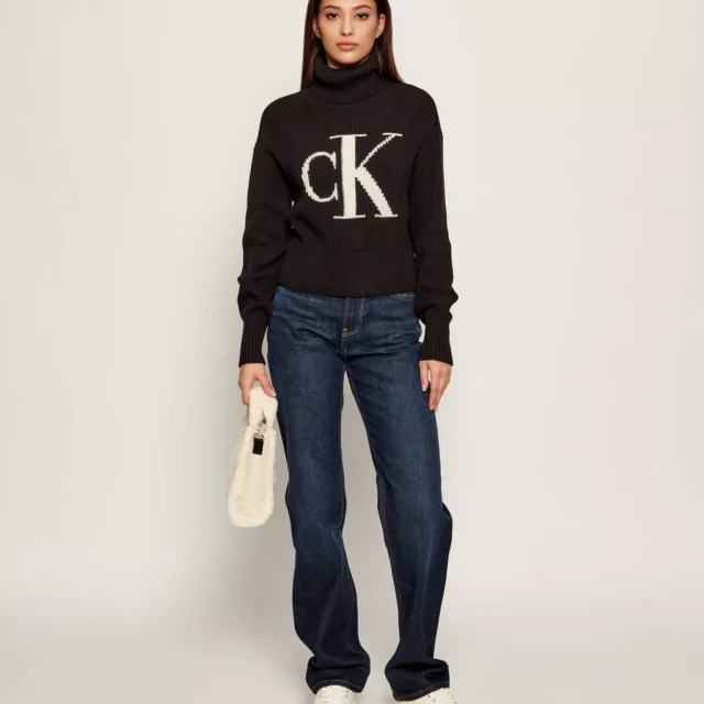 The sweater’s rich black color offers a sleek and refined aesthetic, while the eye-catching print design adds a modern twist. The long sleeves and cozy turtleneck make it an ideal choice for the cooler months, keeping you warm without compromising on style. This Calvin Klein knitwear piece is more than just a basic sweater—it’s a statement of comfort and fashion.