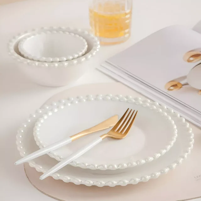 This set includes everything you need for a variety of dishes. From warm soups and rice to steaks, snacks, or desserts, each piece is designed to elevate your food presentation. Its unique pearl-beaded edge makes it stand out from ordinary dinnerware, turning simple meals into an inviting dining experience.