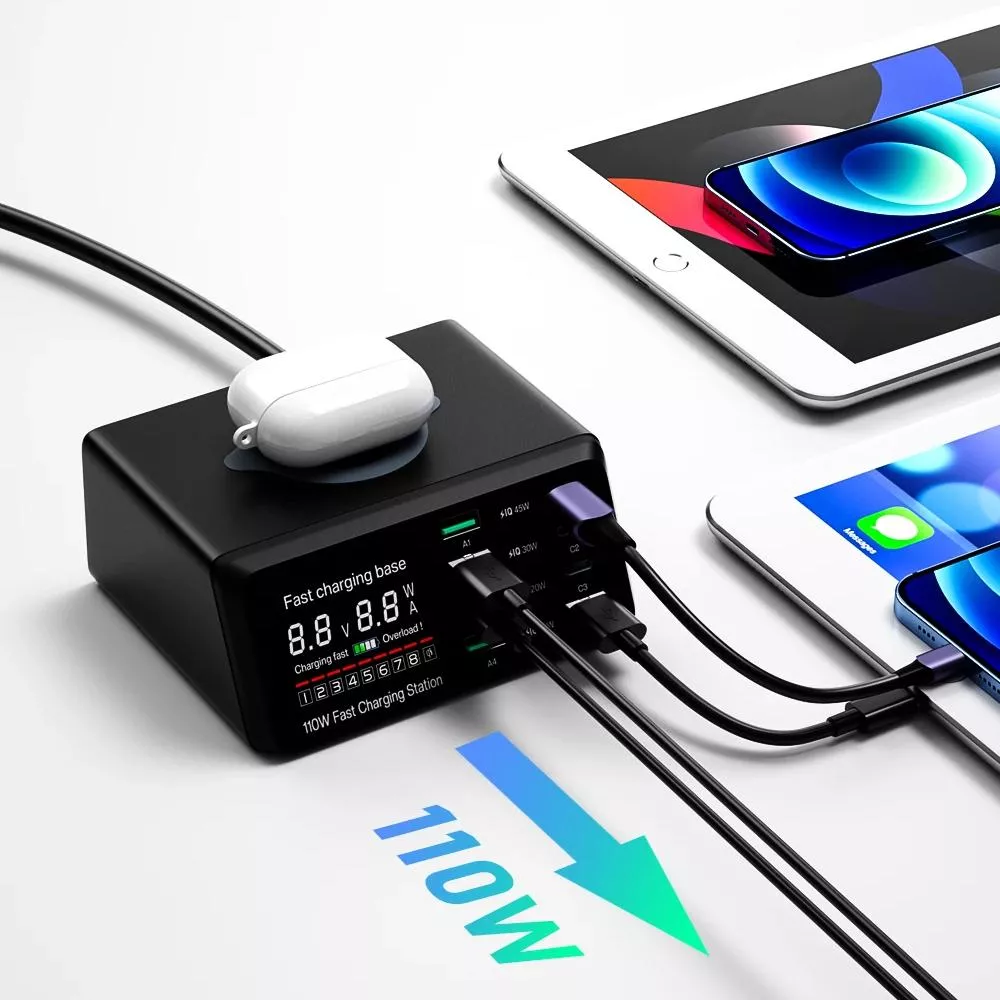 110W Multi-Port Fast Charger with Wireless Charging and Dual USB-C Ports