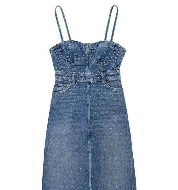 Our mini dress is crafted with a meticulous blend of synthetic fibers, ensuring a sleek fit without compromising on comfort. Released for Summer 2023, it embodies contemporary fashion with a timeless silhouette. The non-stretch polyester denim offers a slim fit, accentuating your natural curves while the back zipper provides a secure and flattering closure. Attention to detail is evident in the three-dimensional decorations that add an extra touch of sophistication.