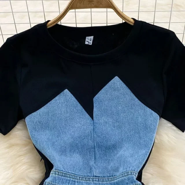 Embrace the seamless blend of casual sophistication and contemporary fashion with our Chic Denim Splice A-Line Dress. Perfectly suited for the modern woman, this dress is a staple for any season, offering versatility and style in one. The simplicity of the design, complemented by the innovative denim splice, creates an illusion of a two-piece ensemble that will keep heads turning whether you’re at a brunch or an office event. Its round neck and short sleeve combo present a flawless canvas for accessorizing or keeping it stunningly minimalist.
