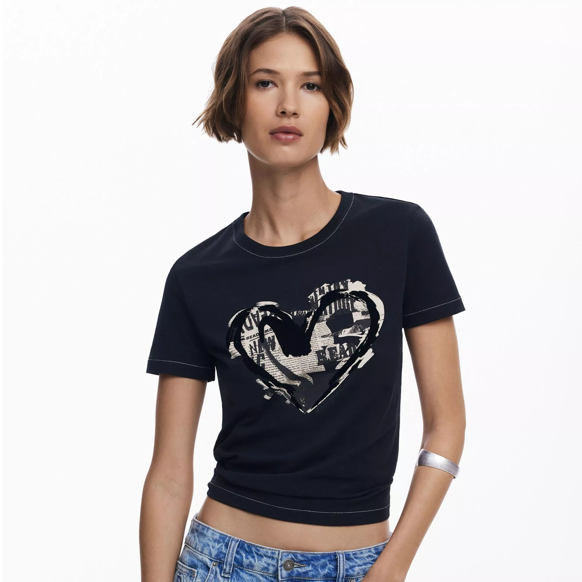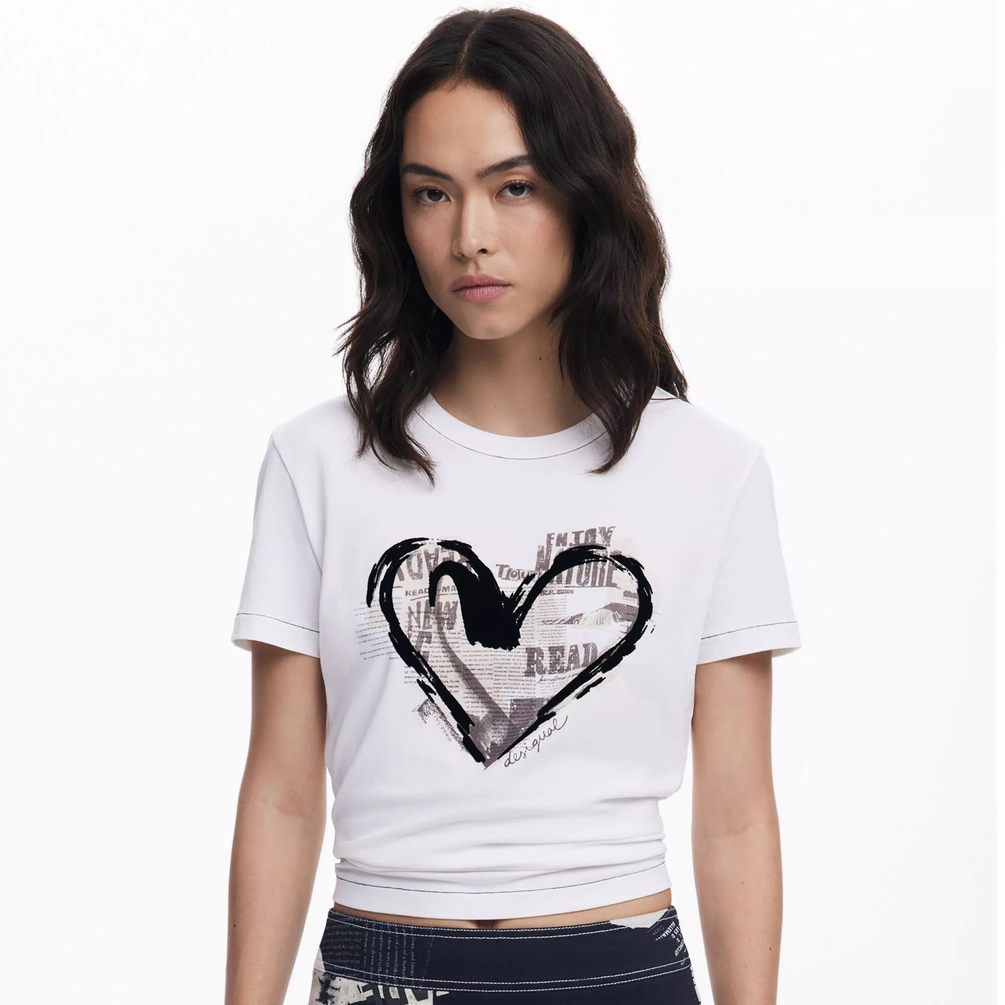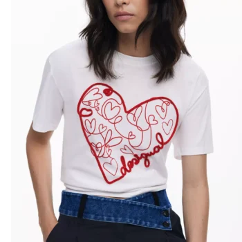Desigual Women’s White T-Shirt with 3D Embroidered Heart Design