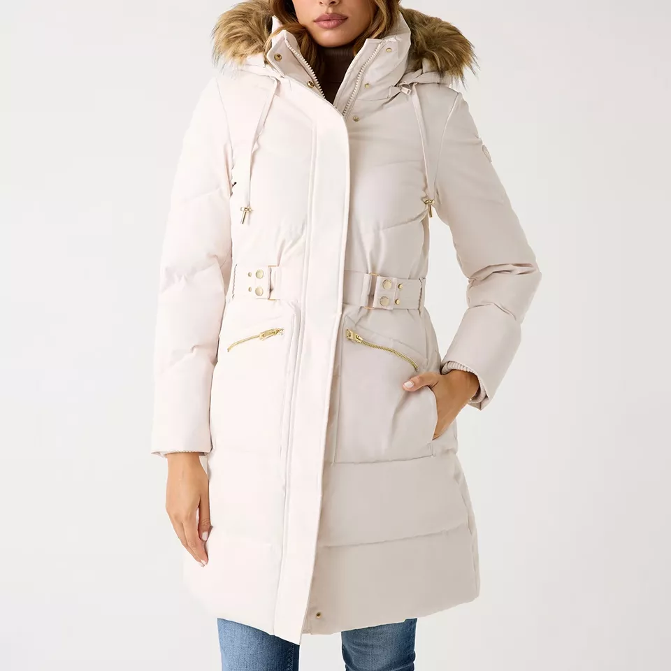GUESS Long Puffer Jacket in Cream with Faux-Fur Trim