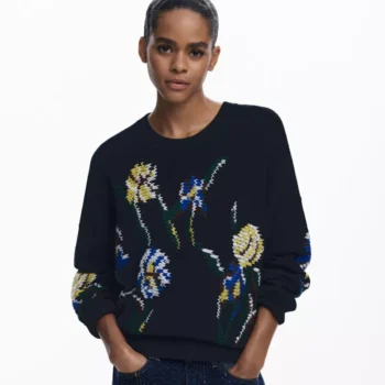 Desigual Women’s Black Floral Cotton Knitwear – Long Sleeve Round Neck
