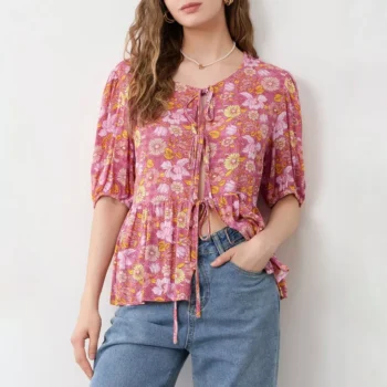 Floral Lace-Up Bow V-Neck Blouse