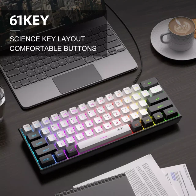Looking for a keyboard that saves space without sacrificing performance? This 60% compact wired keyboard with 61 keys is designed for gamers, professionals, and everyday users who want style, comfort, and functionality in one sleek package. With vibrant RGB backlighting, a mechanical-like typing feel, and a durable waterproof build, it’s the perfect addition to your desk whether you’re working late nights or powering through your favorite games.