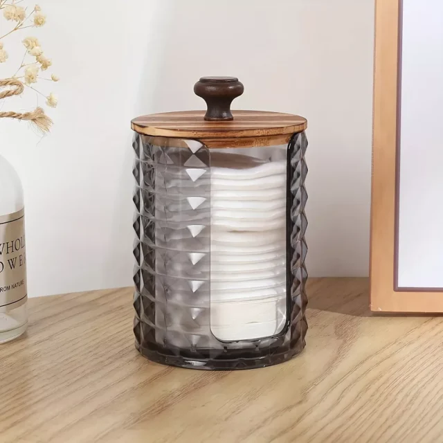 Designed with both beauty and functionality in mind, this holder is compact yet spacious enough to store plenty of cotton pads. Its transparent body allows you to easily see when it’s time for a refill, while the natural wooden lid adds a touch of warmth and sophistication to your décor. Whether you’re removing makeup, applying toner, or handling quick touch-ups, this container keeps your essentials clean and organized.