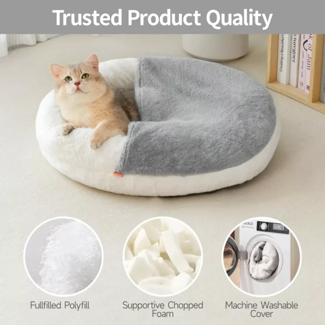 The unique donut shape and high edges provide head and neck support, while the spacious 22″ x 22″ size comfortably fits cats and small pets up to 20 lbs. Its hidden zipper makes it easy to assemble or remove for cleaning, and the non-slip bottom keeps it firmly in place, even during playful moments. This cat cave bed is perfect for daily lounging, cozy nighttime sleep, or as a special resting spot during cold seasons.