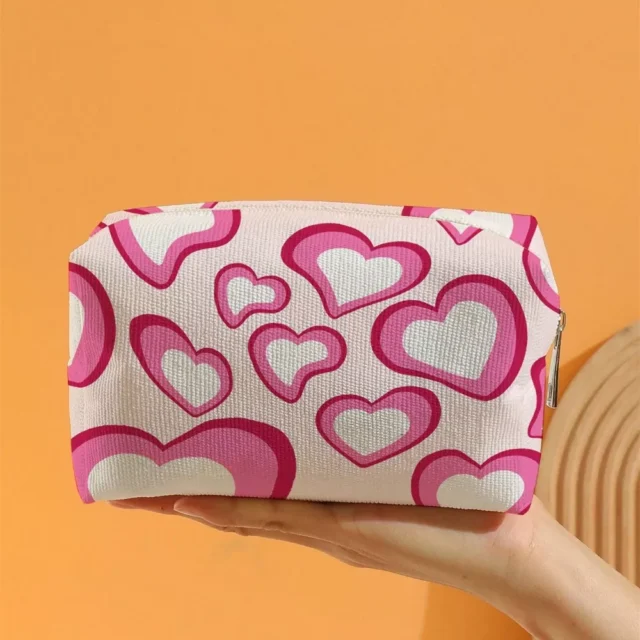 Unlike ordinary cosmetic pouches, this heart-shaped printed makeup bag stands out with its fun design and practical box shape. It’s lightweight enough to carry anywhere, yet spacious enough to hold all your beauty must-haves. The combination of cuteness and functionality makes it a charming accessory that doubles as a reliable organizer.