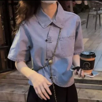 Summer Chic Denim Crop Shirt – Women’s Asymmetrical Thin Denim Top