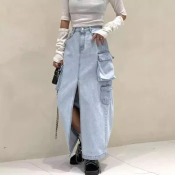 High Waist Vintage Denim Cargo Skirt with Front Split