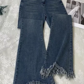 Korean High Waist Flare Jeans – Tassel Hem Button Fly Denim