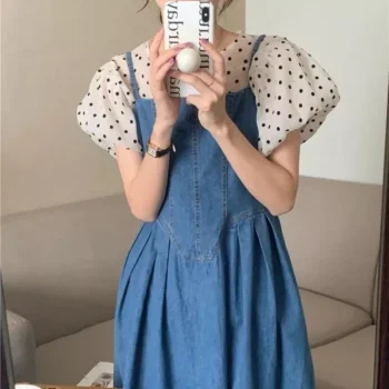 Chic Puff Sleeve A-Line Denim Mini Dress – Casual Pleated Summer Sundress