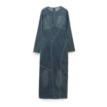 Winter Long Sleeve Denim Maxi Dress with Slit – Casual & Chic