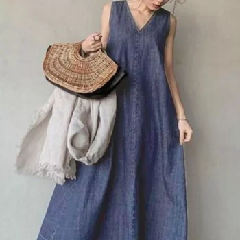 2023 Summer Denim Maxi Dress – Casual Vintage V-Neck Sleeveless