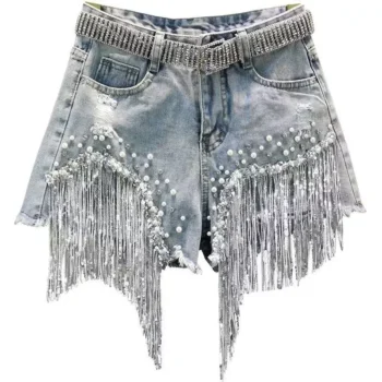 Elegant Tassel Bead High-Waist Denim Shorts for Women